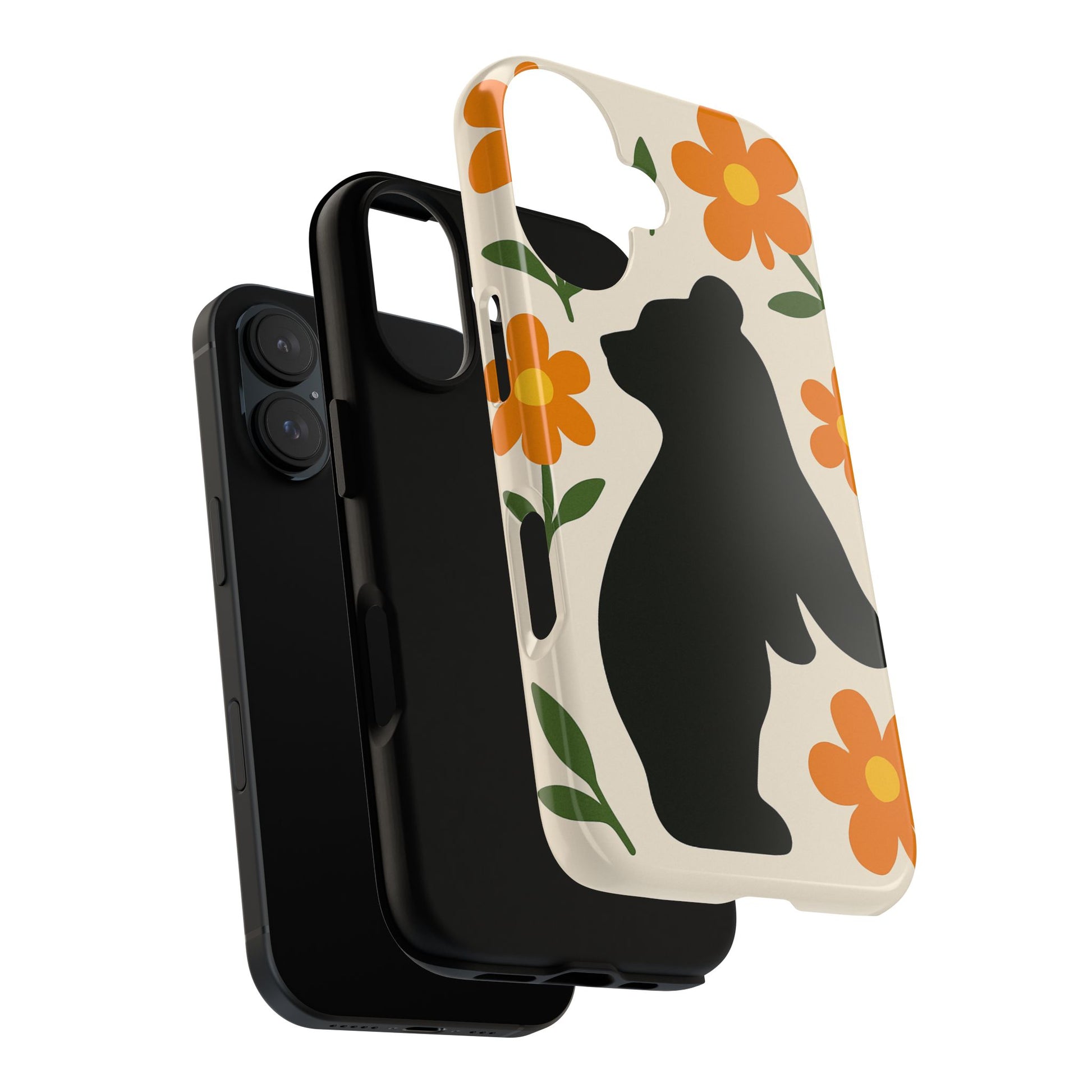 This lightweight, dual-layer phone case blends playful vintage florals with a bold silhouette for a look that feels warm and familiar. The matte/gloss finish carries a full 3D wrap print so the orange blossoms and dark bear profile flow around edges without interruption. Inside, a soft TPU silicone liner cushions shocks while the rigid polycarbonate shell resists impacts and keeps the design intact. It’s built to handle daily knocks and outdoor wear — UV protection preserves color, RoHS/REACH certified materials keep it safe, and clear port cutouts let you charge wirelessly without removing the case. The result is a protective, stylish cover that slips into everyday life with comfort and charm.