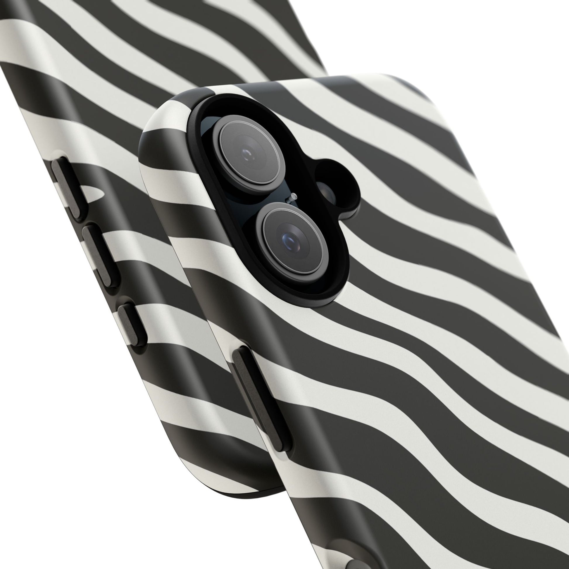 This sleek protective phone case blends bold zebra-wave graphics with serious everyday protection. The glossy black-and-white print wraps fully around the shell, creating a continuous, high-contrast pattern that stands out in a crowd while resisting outdoor fading. Inside, a soft TPU silicone liner cushions shocks and dampens impacts; the rigid polycarbonate outer shell and dual-layer construction guard against drops and rough handling. Thoughtful cutouts keep ports open and wireless charging compatible, so the case keeps your phone functional and fashionable without adding bulk. Finished with UV-protective inks and certified for safety and materials, it gives long-lasting visual impact and dependable protection for adults who want style and durability in one.